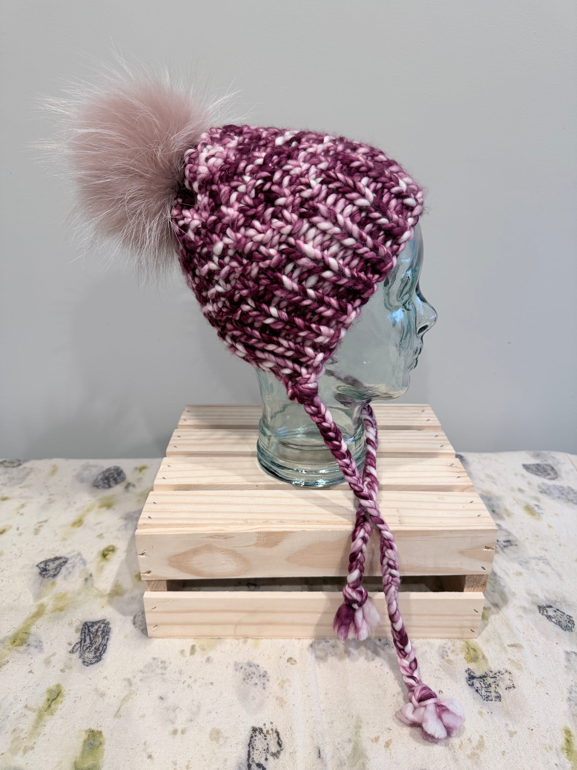 100% Merino Wool bonnet style beanie. Topped with our signature Roadkill Raccoon fur Pom. This style covers your ears and the nape of your neck without feeling restrictive. Fits a wide variety of sizes from your average adult head to the largest of heads because of the opening.