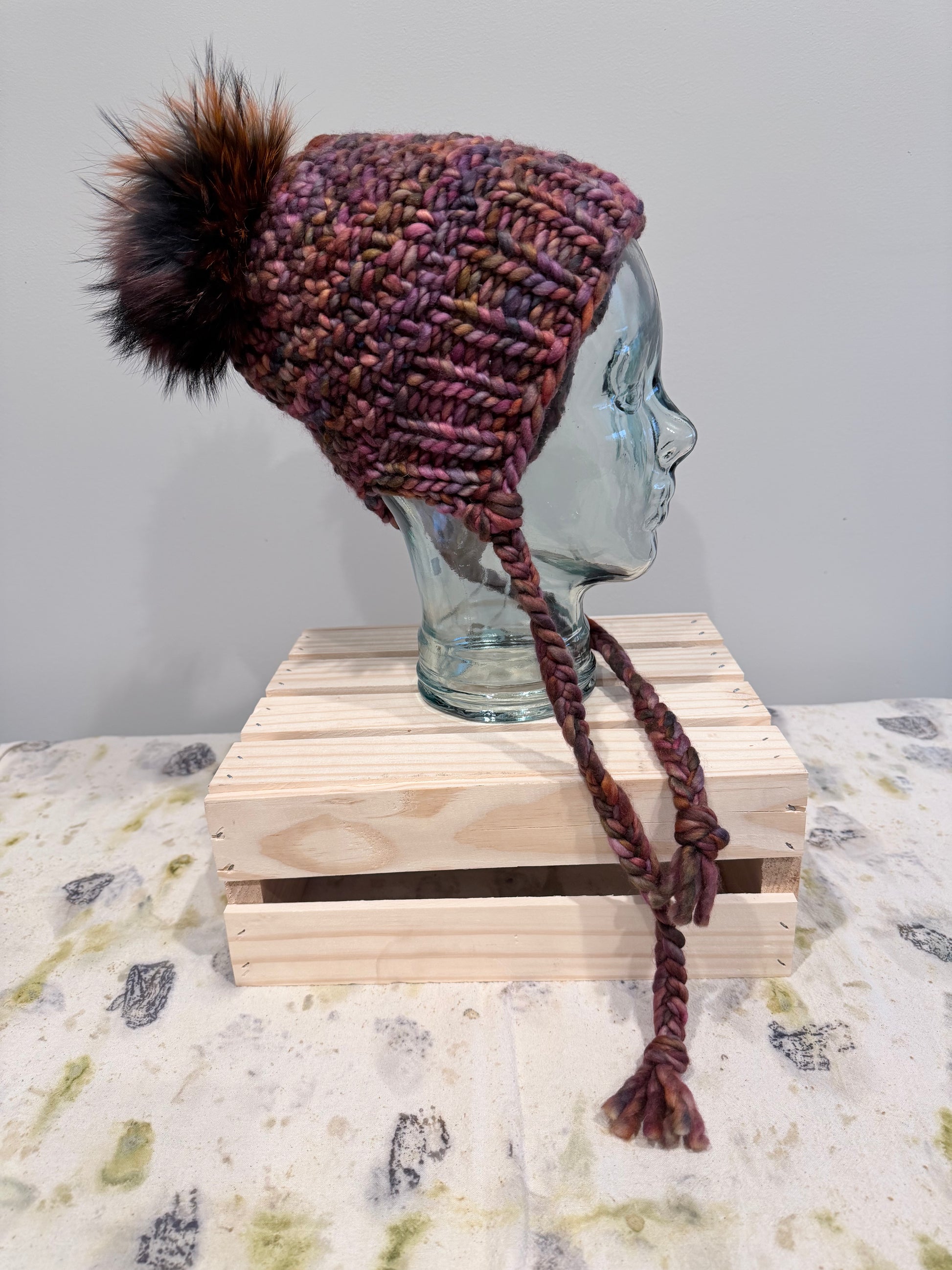 100% Merino Wool bonnet style beanie. Topped with our signature Roadkill Raccoon fur Pom. This style covers your ears and the nape of your neck without feeling restrictive. Fits a wide variety of sizes from your average adult head to the largest of heads because of the opening.